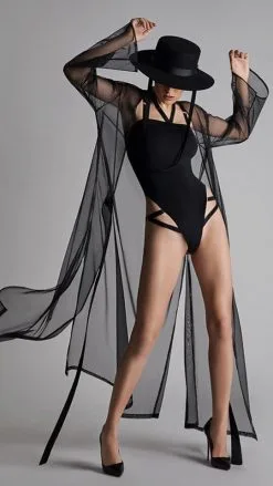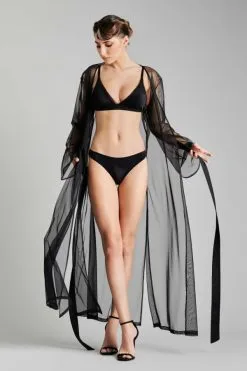Langer Kimono mit Tüllgürtel. Mit Trompetenärmeln. Kann offen oder geschlossen getragen werden.