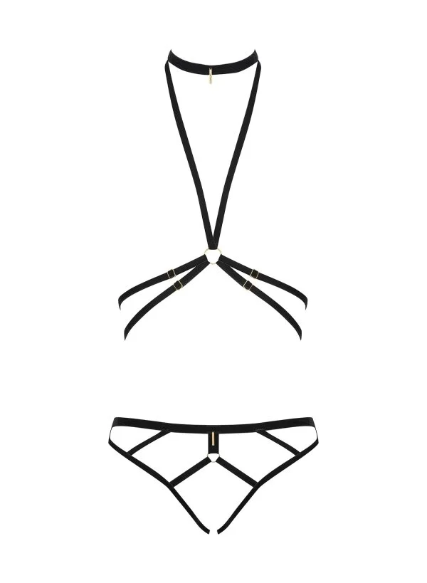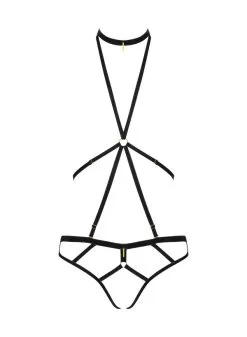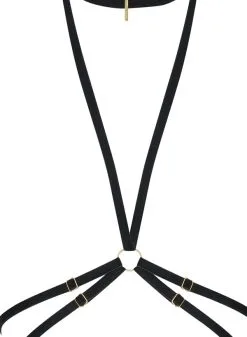 Eine sehr edle Harness Variante mit goldfarbenen Verbindungsteilen.Der Harness wird hinten geschossen und verläuft zwischen den Brüsten und endet um den Hals, wodurch ein Chocker-Effekt entsteht. Der Harness kann mit dem passendem Slip verbunden werden. (optional erhältlich)