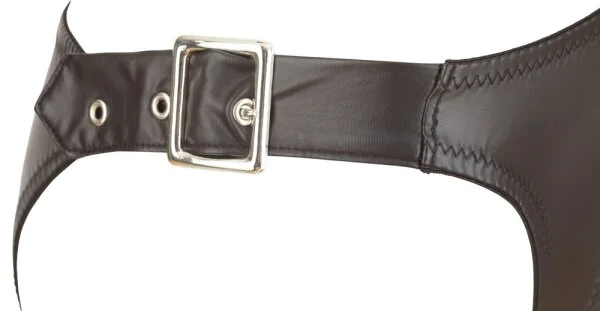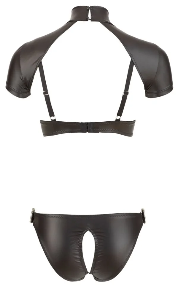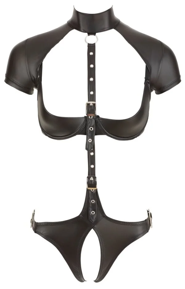 Dieser Body vermittelt in seinem schwarzen Mattlook und den raffinierten Details einen dominanten Edel-Look! Mit leicht gepolsterten Hebe-Cups mit Bügeln, verstellbaren Trägern, Stehkragen mit 2 Knöpfen hinten sowie verstellbarem Steg vom Kragen bis zum Slip.