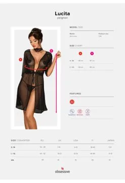 Morgenmantel gefertigt aus einem Mix aus weichem Mesh und zarter Spitze. Das anschmiegsame Material liegt angenehmen auf der Haut. Der abgebildete String und die Pasties gehören nicht zum Lieferumfang.