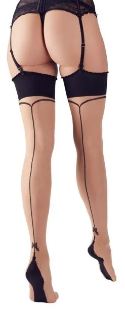 Strapsstrümpfe mit elegantem Abschluss und ästhetischer Naht. Eine kleine Schleife ist über der Hochferse eingewebt. Die Zehen sind für mehr Strapazierfähigkeit verstärkt. 20 DEN, Oeko-Tex zertifiziert.