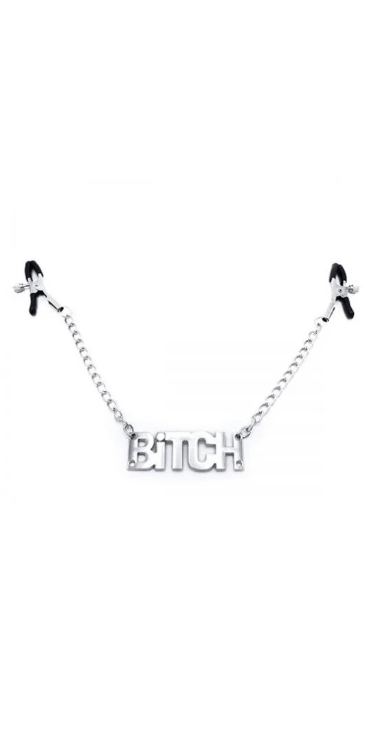 Nippelklammern mit Metallkette und Schriftzug: Bitch. Die Druckstärke der Klemmen ist spielend leicht durch Schieberinge individuell justierbar von sanft bis hart! Aus silberfarbenem Metall. 41g schwer.