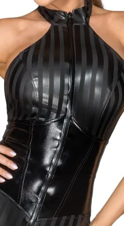 Dieses Minikleid besticht im atemberaubend gestreiften Powerwetlook und schmiegt sich den weiblichen Kurven wie eine zweite Haut. Im raffinierten Neckholder-Look mit Halsband und extra tiefem Rückenausschnitt. Ein durchgehender Reißverschluss in der Front macht den extravaganten Look perfekt. Hauptmaterial: 80% Polyamid + 20% Elasthan, Einsatz: 100 % Polyester