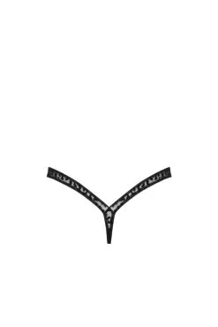 Eine wilde Variante des klassischen schwarzen Strings aus Leopardenflock. Materialzusammensetzung: 84% Polyester, 16% Elasthan.