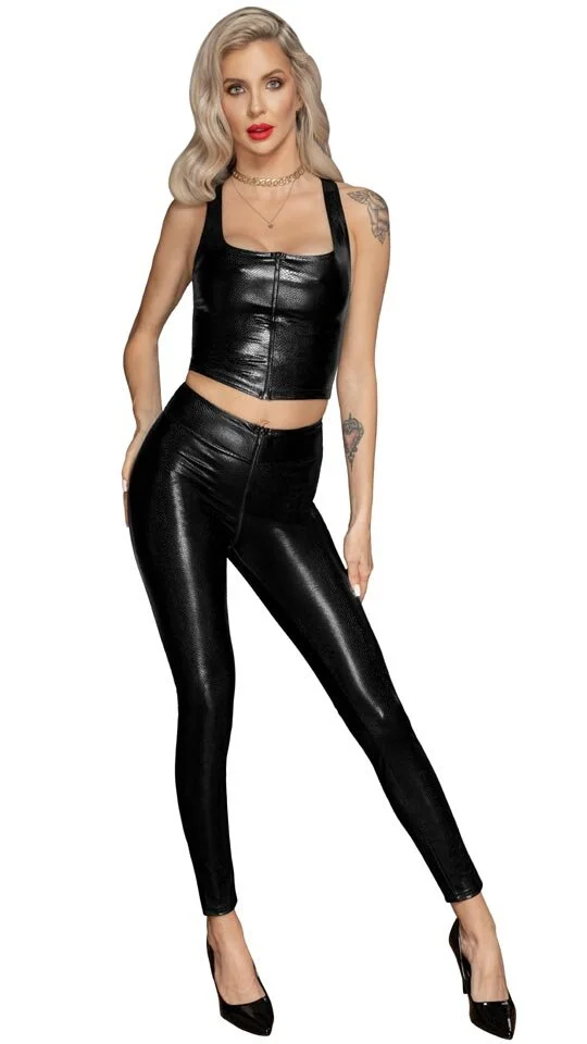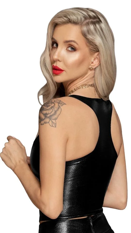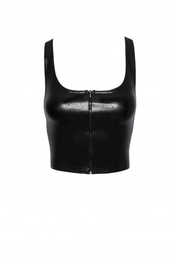Klassisch und zugleich verspieltes Wetlook-Top mit Frontreißverschluss. Ein sexy Basic für die Garderobe jeder Frau Materialzusammensetzung: 80% Polyester, 20% Elasthan.
