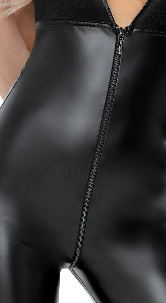 Hauteng geschnittener Overall von Noir in mattglänzend schillernder Schlangenhaut-Optik (Oberteil) im Mix mit Powerwetlook – schmiegt sich an wie eine zweite Haut. Dabei weich und elastisch für maximalen Tragekomfort. Mit Neckholder zum Binden – aufregend rückenfrei bis zum Po. Praktisch und erotisch zugleich ist der 3-Wege-Reißverschluss, der vom extra tiefen Dekolleté durch den Schritt bis über den Po verläuft – er lässt sich vielseitig öffnen und schließen.