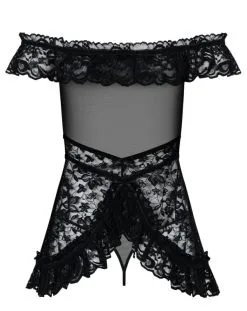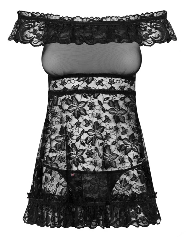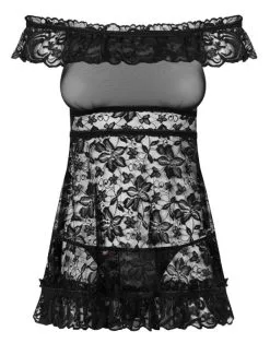 Das transparente Babydoll mit Spitze, Carmenausschnitt und leicht ausgestelltem Saum lässt Männerherzen höherschlagen.