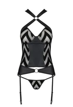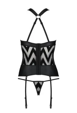 Verführerische Strapscorsage in Lederoptik sowie feinmaschigem Netz. Mit eingearbeiteten Bügeln sowie verstellbaren Trägern. Die Corsage wird auf der Rückseite auf der kompletten Länge mit einem 2-fach verstellbaren