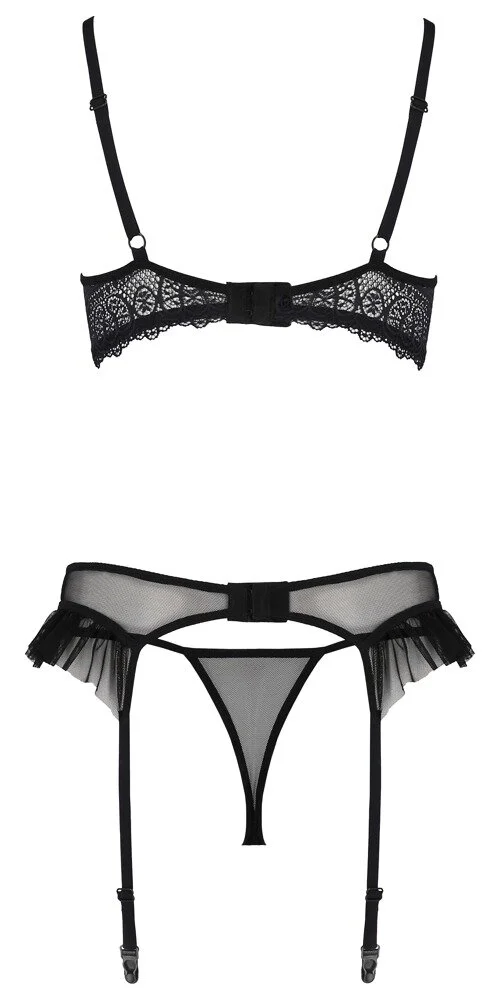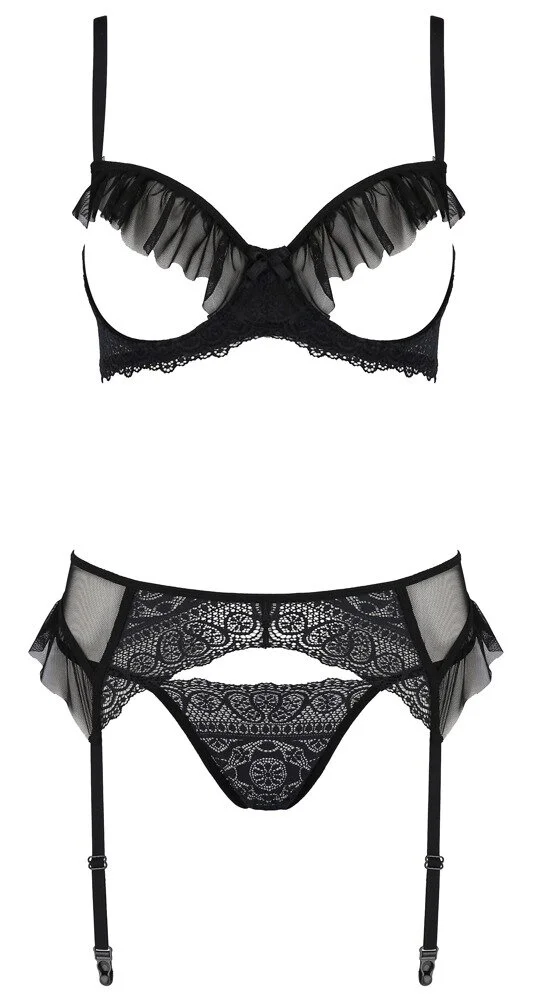 Bügel-BH, Strapsgurt und Riostring im Kerria Set with open Bra aus der Eco Collection von Passion. Alle drei Teile gefertigt aus transparent-elastischem Powernet im Mix mit feiner fantasievoller Spitze. Der Bügel-BH reizt mit offenen Cups und verspielten Volants – genauso wie der Strapsgurt. Beides mit Hakenverschluss im Rücken. Der Riostring mit Spitzenfront wird seitlich nur von reizvoll schmalen Stretchbändern gehalten. BH-Träger und Strumpfhalter sind für perfekte Passform in der Länge verstellbar.