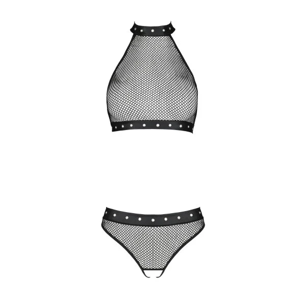 Sexy 2-teiliges Set gefertigt aus einem Mix aus Wetlook sowie grobmaschigem Netz. Das Oberteil kann auf der Rückseite individuell eingestellt werden.