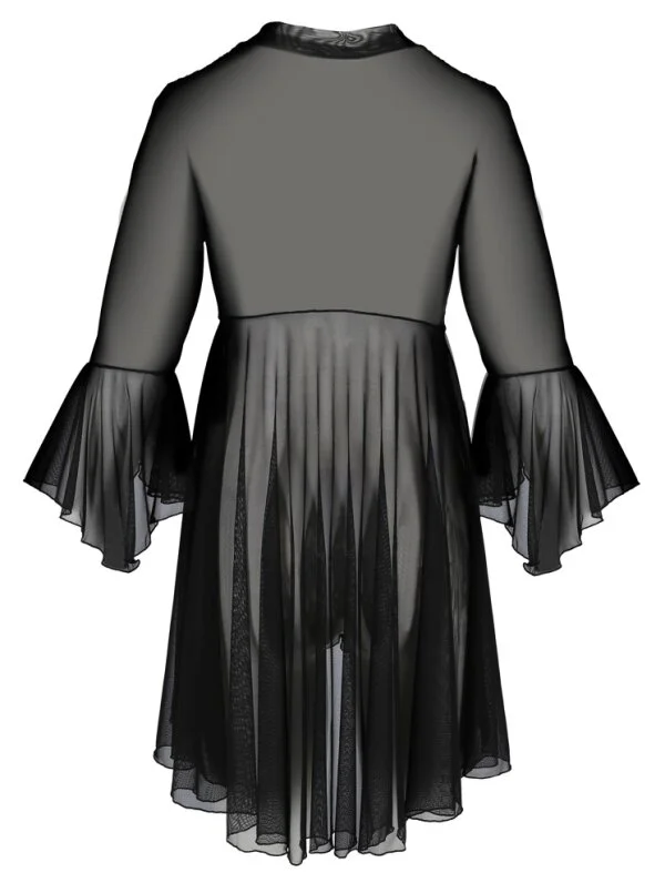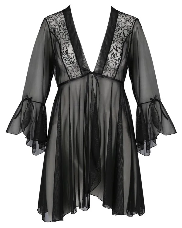 Weich fallender, kurz geschnittener Kimono Primula Peignoir aus der ECO Collection von Passion sind aus transparent-elastischem Powernet gefertigt. Vorne komplett offen mit kleiner Bindeschleife, oben jeweils seitlich mit Einsätzen aus feiner Ausbrenner-Spitze. Der Saum ist weit schwingend ausgestellt dabei hinten ein bisschen länger als vorne geschnitten. Passend dazu die weiten, halblangen Trompetenärmel.