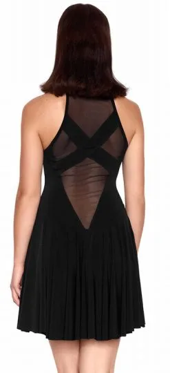 Dieses Kleid ist sehr sexy, welches am Oberkörper eng am Körper sitzt und einen lockeren Swingrock hat. Die Netzausschnitte und die Lycra-Bänder kreuzen sich. Der Rundhalsausschnitt ist mit kleinen goldfarbenen Nieten verziert.