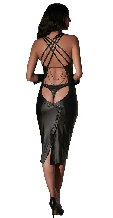 Knielanges Bleistiftkleid mit zartem transparentem Ausschnitt. Auf der Rückseite kreuzen sich sechs Riemen, die den oberen Rücken hervorheben. Eine tiefe Öffnung zeigt den Po-Ansatz. Zwei dünne Gummibänder unter den Bändern in Kettenoptik geben dem Kleid guten Halt. Es kann mit Druckknöpfen unten am Gesäß geöffnet werden.