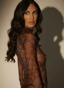 Zartes und hauchdünnes Kleid aus feinem schwarzen Mesh von P´tite Folies by Patrice Catanzaro aus Frankreich. Lange Ärmel, Stehkragen und ein rotes Blumenmotiv.