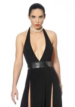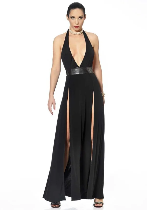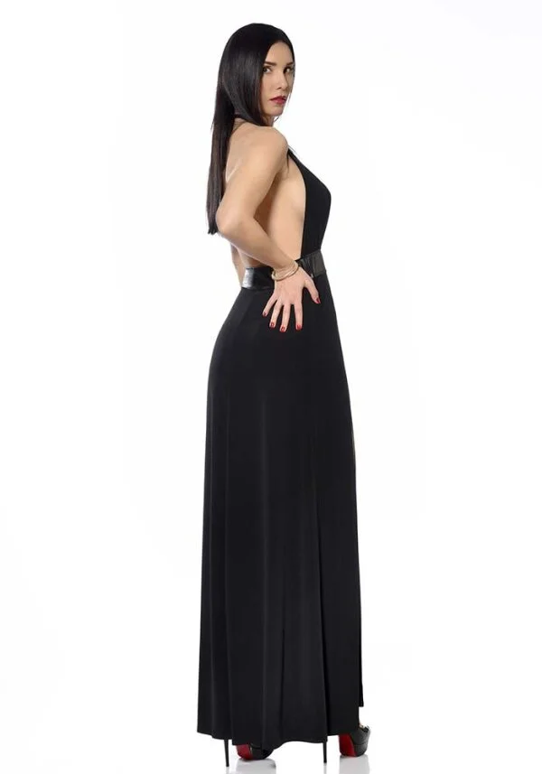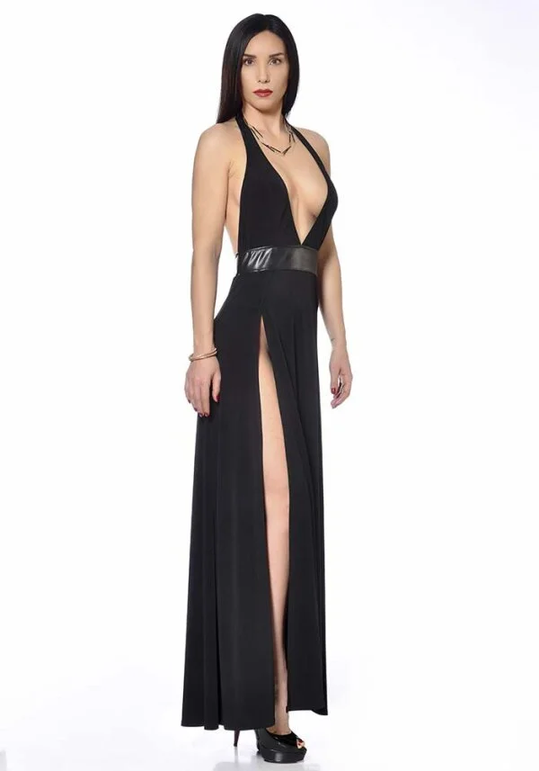 Sehr langes Lycra-Kleid mit sehr verführerischen Schlitzen im Ock. In der Mitte ist eine Lackband eingearbeitet. Design by Patrice Catanzaro aus Frankreich.