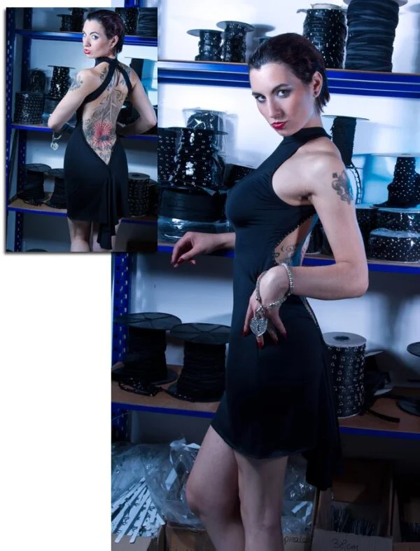Lassen Sie sich von diesem Kleid und seinem großen Ausschnitt auf der Rückseite verführen. Auch der Po wird durch den Ausschnitt besonders betont. Das Kleid hat einen wunderschönen V-Ausschnitt mit kleinen glänzenden Strasssteinen an den Rändern. Das Kleid besteht aus Lycra, einem dehnbaren Stoff, der sehr bequem und leicht zu tragen ist. Es schließt mit einem Häkchen im Nacken.