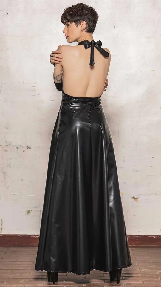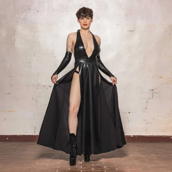 Sehr langes Wetlook-Kleid mit sehr verführerischen Schlitzen im Rock. Design by Patrice Catanzaro aus Frankreich.