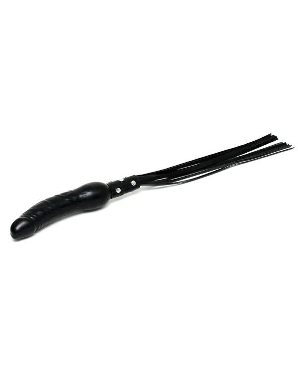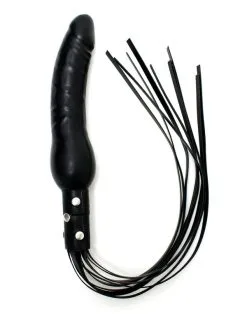 Dieser schwarze Latexdildo ist gleichzeitig Peitschemgriff. Der Dildo hat silberfarbene Details und die Peitsche besteht aus mehreren Ledersträngen.