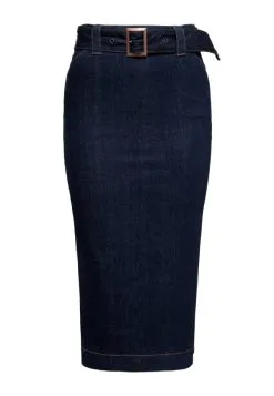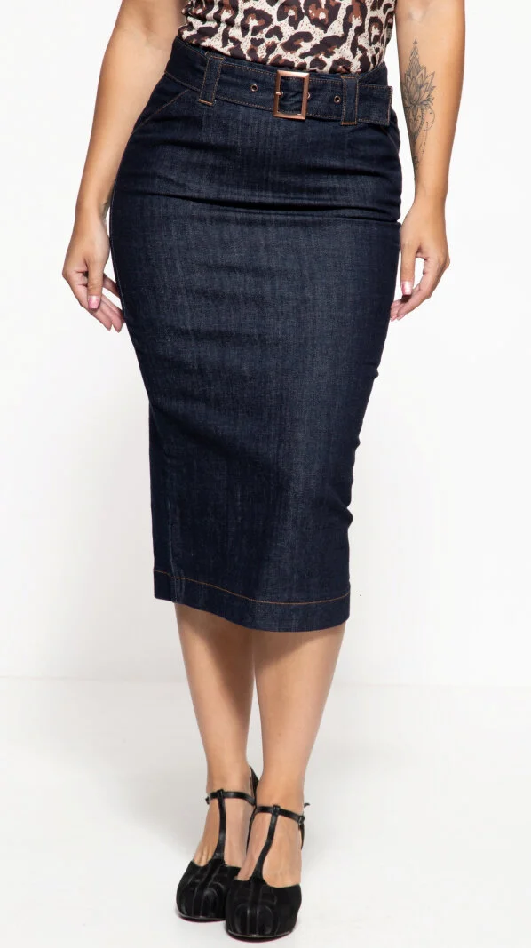 Der klassische Schnitt dieses Bleistiftrocks hat standesgemäß eine hohe Taille und endet unterhalb des Knies. Durch den super engen Slim Fit sitzt der Rock wie angegossen und es werden die weiblichen Kurven ideal betont, was alle Männer schwach werden lässt. Und keine Sorge, für einen bequemen Sitz und ein komfortables Tragen ist durch den Stretch-Anteil im Denim-Gewebe gesorgt. Ein Gürtel in der Taille verpasst dem Ganzen einen Cinched Waist Look. Zu den Schnittdetails die einem das Leber erleichtern gehören die praktischen Eingrifftaschen und der Schlitz in der hinteren Mitte, für eine optimale Bewegungsfreiheit. Ebenfalls in der hinteren Mitte befindet sich der Reißverschluss. Eine legere Waschung verleiht dem Ganzen den letzten Schliff. Der Pencil Skirt erweist sich als idealer Kombipartner, auf dem sich zahlreiche Looks aufbauen lassen…ergo ein Must-Have für Ihre Garderobe!