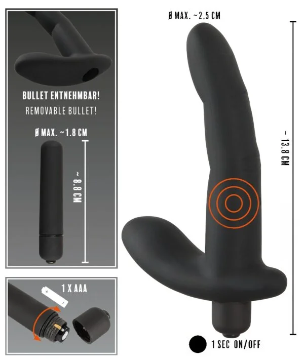 - Gesamtlänge 13,8 cm, Einführlänge 10 cm, Ø 1,7 cm bis 2,5 cm. Vibrobullet 8,8 cm lang, Ø 1,8 cm. Gewicht 80 g. Silikon, PU, ABS. Batterie bitte extra bestellen: 1 x AAA.