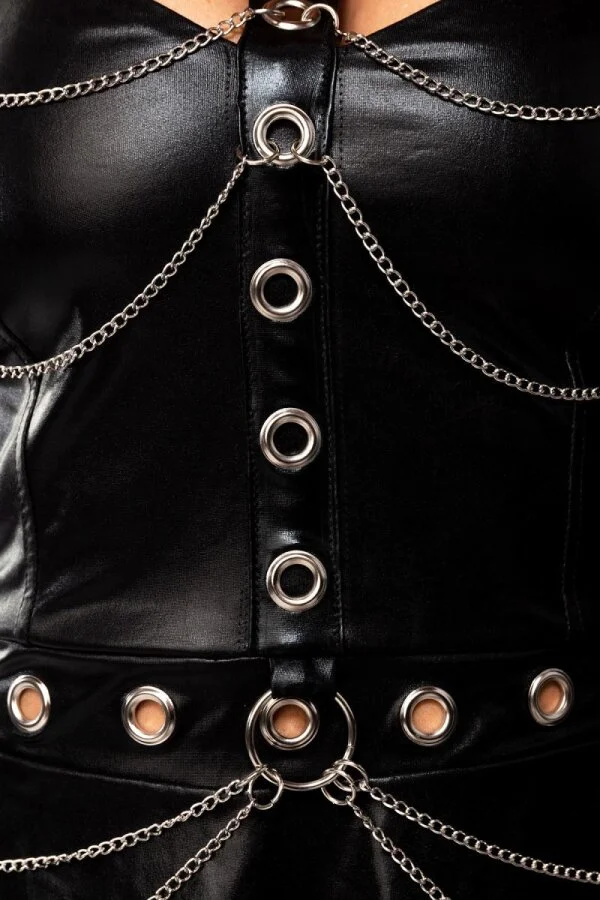 Ein Minikleid aus Wetlook mit Herzauschnitt und Halsband mit Klettverschluss