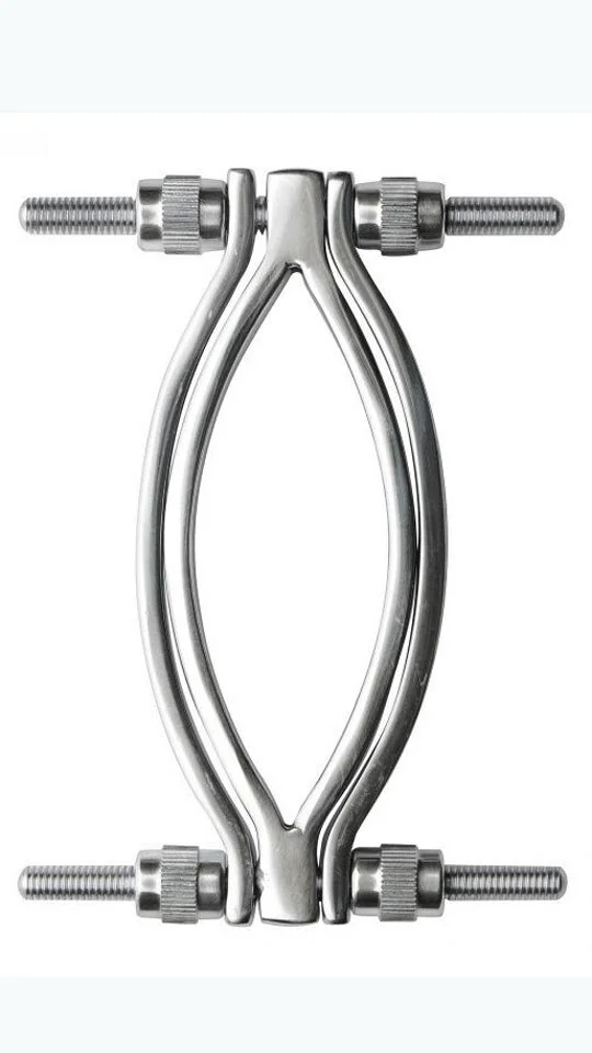 Diese Klemme ermöglicht es Ihnen, die Schamlippen weit zu spreizen. Mit den Rändelschrauben öffnen Sie die Außenseiten um dann die inneren oder äußeren Schamlippen durchzuziehen. Ziehen Sie die Rändelschrauben an, was dann zu einem kneifendem Schmerz führt!
