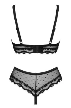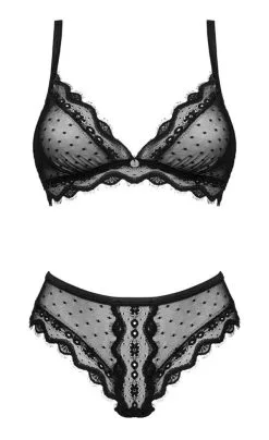 BH und String als Set in schwarzer Pünktchen-Transparenz mit zarter Wimpernspitzen-Verzierung. Seidig weich und elastisch für hohen Tragekomfort. BH mit Schmuckelement zwischen den Soft-Cups, die Träger sind passend verstellbar. Der dazu passende String punktet mit seinem raffinierten Schnitt, der Beine und Po aufregend betont.
