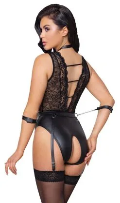 Extra tief dekolletierter Strapsbody-Ouvert mit transparentem Oberteil aus feiner Spitze und schrittoffenem Slipteil im edlen Wetlook. Im Rücken ebenfalls ein tiefer V-Ausschnitt mit Stretchbändern, die alles schön zusammenhalten. An dem Gürtel sind an Ringen die Strumpfhalter fest angebracht. Am Frontring des Gürtels kann die Karabinerkette mit dem Halsband befestigt werden – und an den Ringen seitlich die beiliegenden Fesselriemen mit den Karabinerketten. Gürtel und Strumpfhalter sind in der Passform verstellbar, der Gürtel mit den Strapsen kann auch ganz abgenommen werden. Die Fesselriemen haben verstellbare Klettverschlüsse. Die Strümpfe gehören nicht zum Lieferumfang.