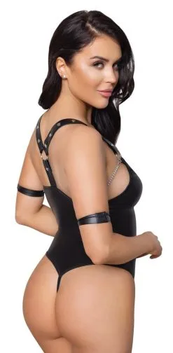 Stringbody ouvert im edlen schwarzen Wetlook mit silberfarbenen Metallelementen. Vorne komplett offen – nur 3 dekorative große Ringe halten alles schön zusammen. Raffiniert sind die breiten Träger, die im freien Rücken in einem Ring mit Steg zusammengeführt werden. Mit den Druckknöpfen sind die Träger für optimale Passform verstellbar. An den Ringen der Träger können für lustvolle Fixierungen die beiden beiliegenden Fesselriemen (mit Klettverschlüssen) mit den Karabinerketten befestigt werden.
