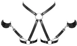 Taillengurt mit Beinfesseln plus abnehmbare Handfesseln komplett aus Leder. Die verstellbaren Handfesseln sind jeweils mit einem Lederriemen ausgestattet, der an jedem Ende über einen Karabiner verfügt. So sind die Handmannschetten fix an den Taillengurt oder die Beinfesseln eingehakt – oder zusammengehakt als Handfessel solo zu benutzen. Der Taillengurt, die Oberschenkelgurte und die Handgelenkmanschetten (Umfang 15-23 cm) sind vielfach mit Schnallenverschlüssen verstellbar.