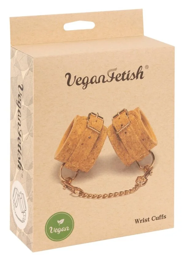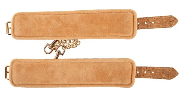 Stabile, hochwertige Handfessel von Vegan Fetish aus natürlichem Kork mit der typischen schönen Optik. Verbindungskette und Metall-Elemente sind im goldfarbenen Glanz. Die Manschetten sind für hohen Tragekomfort innen mit farblich abgestimmtem leichten Plüsch gefüttert und haben jeweils einen Ring zum Einhängen der beiliegenden Karabiner-Verbindungskette. Jeweils mit Schnallenverschluss im Umfang von 12 cm bis 26 cm verstellbar. Verbindungskette mit 2 Karabinern 23 cm lang.