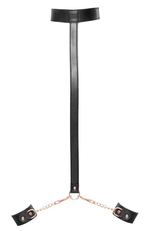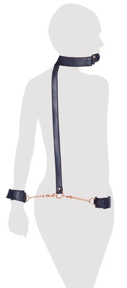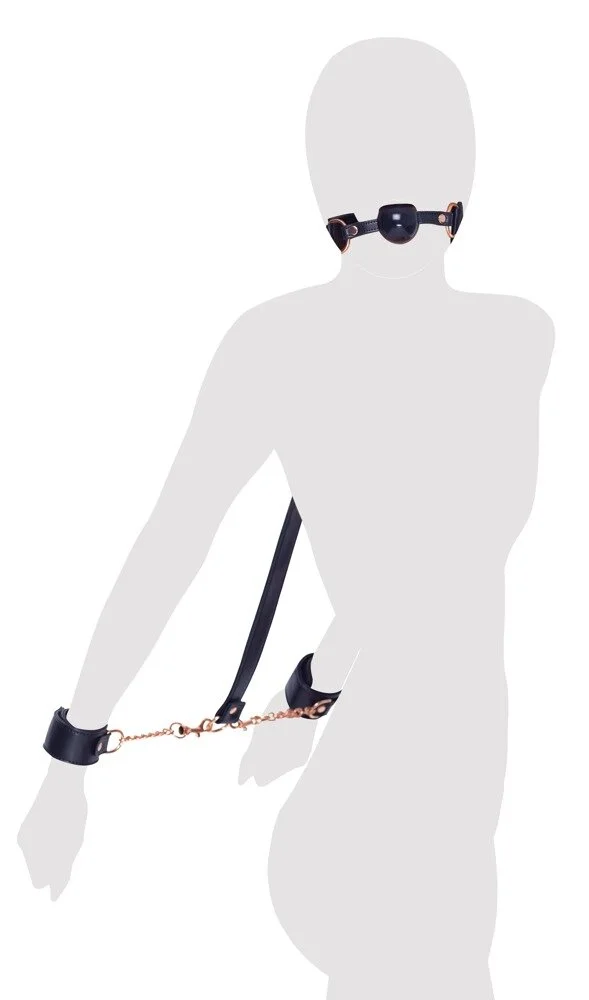 Knebel mit Handfesseln und roségoldfarbenen Metalldetails. An dem Kopfriemen des Knebels ist hinten der Verbindungsriemen für die Handfesseln befestigt. Der Knebel wird umgelegt und die Hände auf dem Rücken dann außer Gefecht gesetzt. Die komfortablen Fesseln und der Kopfriemen des Knebels sind mit Klettverschlüssen schnell angelegt und im Umfang passend verstellbar. Handfesseln jeweils mit Ring, kurzer Kette und Karabinerhaken – vom Verbindungsriemen mit Ring abnehmbar.