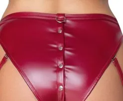 Bralette plus Straps-Slip im edlen roten Wetllook mit feinen schwarzen Spitzen-Einsätzen und silberfarbenen Metallelementen. Das Bralette verführt mit seinen geschlitzten Cups, die dank Druckknöpfen schnell geöffnet werden können. Die Träger und der Unterbrustgurt sind für optimale Passform verstellbar. Der Straps-Slip kann ebenfalls dank Druckknöpfen vom Venushügel bis über den Po geöffnet werden. Seitlich und hinten sind Ringe befestigt, durch die die beiden beiliegenden Fesselriemen (mit Klettverschlüssen) gezogen werden können. Die Stumpfhalter sind verstellbar- und sogar ganz abnehmbar.