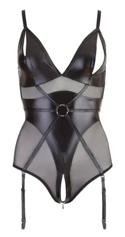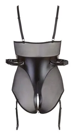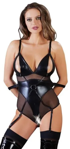 Dieser schwarze Bondage-Body mit Ring in der Mitte, kleinen Zips an den Cups sowie reizvollem 2-Wege-Reißverschluss durch den Schritt bis zum Po kann viel mehr als nur sexy kleiden! Denn im Rücken des erotischen Einteilers überraschen 2 Schlaufen, mit denen Ihr Partner Ihre Arme fixieren und sie so erregend hilflos für seine lustvollen Spielchen einspannen kann. Welch prickelnder Gedanke! Träger verstellbar, Strapshalter abnehm- und verstellbar. Abgebildete Strümpfe gehören nicht zum Lieferumfang und sind optional erhältlich.