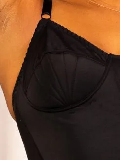 Die untere Hälfte des Körbchens ist leicht mit 3 mm Schaumstoff gepolstert, um die Ziernähte hervorzuheben, während die obere Hälfte des Körbchens und der Samt-Baucheinsatz mit durchsichtigem Dessous-Denier gefüttert sind.
