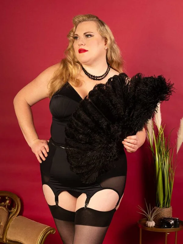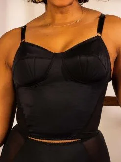 Wunderschöner schwarzer Longline-BH, der sowohl als Unter- als auch als Oberbekleidung genutzt werden kann. Der Beth Longline-BH wird in der gleichen britischen Fabrik wie die Liz-Dessous produziert und weist die gleichen Vintage-Stichdetails auf den Körbchen auf wie der Liz-BH.