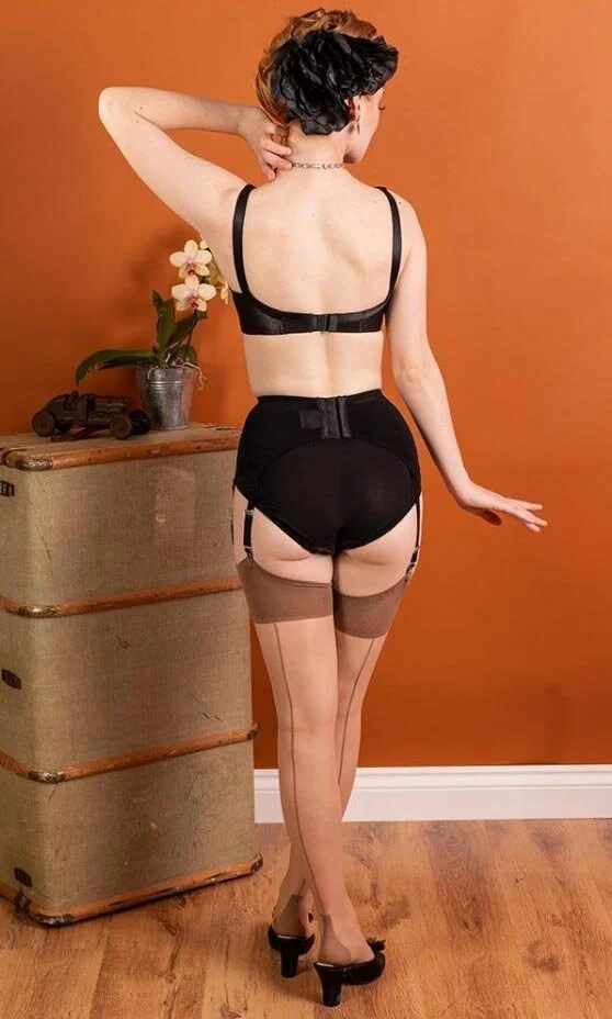 Elegante 15 DEN Nahtnylons mit Ziernaht im 50er-Jahre Vintage-Look. Durch den Elasthananteil haben diese Nylons die Optik der 50er Jahre mit der moderen Passform von heute.