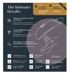 Der Womanizer Premium 2 ist ein starker, dennoch flüsterleiser Druckwellenstimulator und verwöhnt jetzt mit 14 (statt 12) verschiedenen Intensitäten, die bequem per Knopfdruck (+/-) rauf und runter steuerbar sind. Die patentierte Pleasure Air Technology stimuliert die Klitoris haargenau ohne Berührung – auch in Bad und Dusche, da wasserdicht. Die neue verbesserte Autopilot-Funktion wechselt die Intensitäten automatisch, um das Verwöhnen noch überraschender zu gestalten. Dank Smart Silence-Funktion wird der Womanizer Premium 2 nur dann aktiviert, wenn der Kontakt zur Haut gewährleistet ist. Bis dahin läuft der Premium 2 im nahezu geräuschlosen Standby-Modus. Nach 10 Minuten Inaktivität schaltet sich der Womanizer Premium 2 automatisch ab. Der handliche schlanke Verwöhner ist mit einer Full Soft Touch-Oberfläche ausgestattet, die für ein seidig-weiches Hautgefühl beim Verwöhnen sorgt.