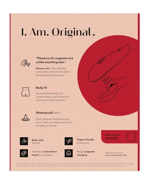 Der Womanizer aus der farblich abgestimmten Marilyn Monroe Special Edition ist ein starker, dennoch flüsterleiser Druckwellenstimulator und verwöhnt mit 10 verschiedenen Intensitäten, die bequem per Knopfdruck (+/-) rauf und runter steuerbar sind. Die patentierte Pleasure Air Technology stimuliert die Klitoris haargenau ohne Berührung – auch in Bad und Dusche, da wasserdicht. Um für einen entspannenden Orgasmus-Ausklang zu sorgen, schaltet der Womanizer per Knopfdruck direkt auf die niedrigste Stufe zurück (Afterglow).