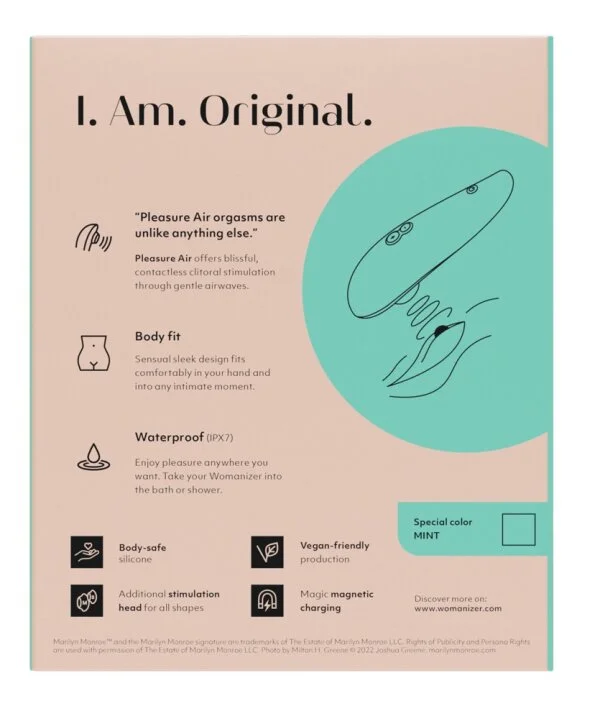 Der Womanizer aus der farblich abgestimmten Marilyn Monroe Special Edition ist ein starker, dennoch flüsterleiser Druckwellenstimulator und verwöhnt mit 10 verschiedenen Intensitäten, die bequem per Knopfdruck (+/-) rauf und runter steuerbar sind. Die patentierte Pleasure Air Technology stimuliert die Klitoris haargenau ohne Berührung – auch in Bad und Dusche, da wasserdicht. Um für einen entspannenden Orgasmus-Ausklang zu sorgen, schaltet der Womanizer per Knopfdruck direkt auf die niedrigste Stufe zurück (Afterglow).
