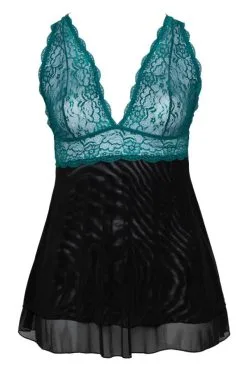 Kurzes Babydoll in Zweiteiler-Optik mit eng geschnittenem Oberteil aus feiner petrolfarbener Spitze und ausgestelltem Rockteil aus schwarzem doppellagigem Powernet. Verführerisch tief dekolletiert. Raffinierte Träger-Lösung: Die Spitzenträger gehen in vier schwarze Stretchträger über, die im Rücken mit einem Ring an einem zarten Spitzendreieck verbunden sind. Die Träger sind für perfekte Passform in der Länge verstellbar.
