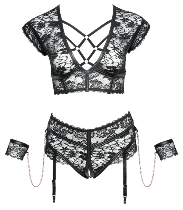BH und Straps-Slip Ouvert aus weicher elastischer Spitze mit Mattlook-Streifen und roségoldfarbenen Elementen. Für fesselnde Lustmomente sorgen die Spitzen-Handfesseln, die mit Karabinerketten an den seitlichen Ringen des Slips befestigt werden können. Der Soft-BH ist etwas länger geschnitten und im tiefen Ausschnitt vorne mit einem Riemenkreuz aus Stretchbändern versehen. Im Nacken hat der BH einen Clip-, im Rücken einen Hakenverschluss. Der Slip ist im Schritt einladend offen. Die verstellbaren Strapse sind vom Slip abnehmbar. Die Strümpfe gehören nicht zum Lieferumfang