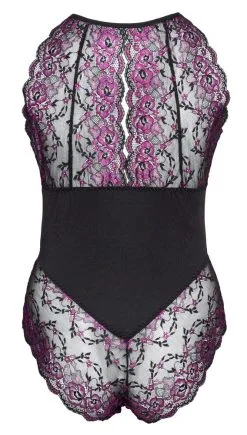 Transparenter Body aus feiner 2-farbiger Blütenspitze mit blickdichtem Einsatz in der Taille. Vorne und hinten raffiniert ausgeschnitten, vorne am Hals mit Clipverschluss. Im Slip-Teil aus Spitze mit erotisch-praktischem Druckknopf-Schrittverschluss.