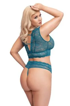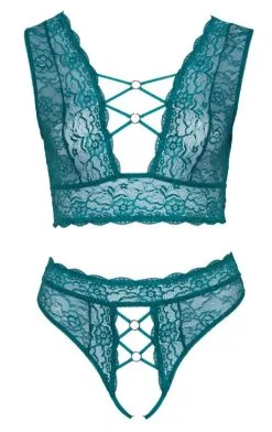 Bralette und String ouvert im Set komplett aus feiner weicher petrolfarbener Spitze. Bralette vorne und hinten extra tief und großzügig ausgeschnitten – roségoldfarbene Ringe und Stretchbänder halten alles schön und höchst dekorativ zusammen. Der hoch geschnittene String verführt ebenfalls mit seiner offenen, mit Ringen und Stretchbändern zusammengehaltenen Front – der Schritt ist einladend geöffnet.