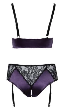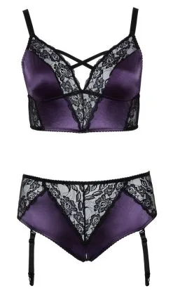 Bralette und Straps-Slip ouvert im edlen Mix aus lilafarbenen Satin und schwarzer feiner Spitze. Das Bralette punktet mit seinen gekreuzten Stretchbändern im Dekolleté, der Taillen-Slip mit seiner einladenden Öffnung im Schritt. Die elastischen breiten Träger sind verstellbar, genauso wie die Strumpfhalter, die vom Slip auch komplett abnehmbar sind. Die Strümpfe gehören nicht zum Lieferumfang.