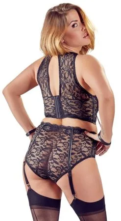 Bralette und Straps-Slip aus weicher elastischer Spitze kombiniert mit Mattlook und roségoldfarbenen Details. Für fesselnde Lustmomente sorgen die abnehmbaren Handfesseln, die mit Karabiner-Ketten am Halsausschnitt des Bralettes befestigt sind. Die Fesseln sind mit einem praktischen Klettverschluss ausgestattet. Das Bralette ist auf Bügel gearbeitet und hat hinten einen Hakenverschluss sowie einen kleinen Clipverschluss oben am Hals. Die verstellbaren Strapse sind vom Slip abnehmbar. . Abgebildete Strümpfe gehören nicht zum Lieferumfang und sind optional erhältlich.