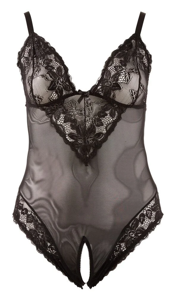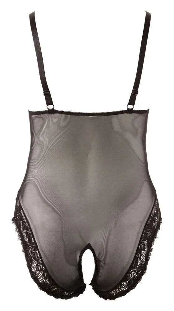 Edler Body ouvert aus semitransparentem Powernet mit verstellbaren Trägern. Mit zarter Blütenspitze an den Cups, die in Richtung Körpermitte spitz ausläuft. Die Beinabschüsse vorne und hinten sind ebenfalls mit Blütenspitze verziert.