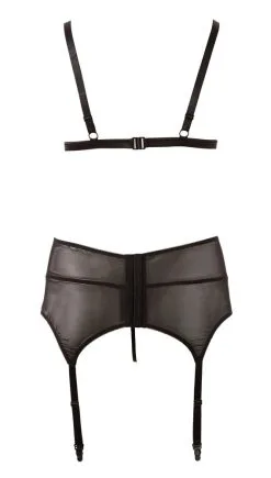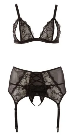 Soft-BH mit offenen Cups, verstellbaren Trägern und Hakenverschluss hinten. Strapsgurt mit Zierschnürungen und vier verstellbaren Strapsen. Dazu passender String. Die Strümpfe gehören nicht zum Lieferumfang und können optional bestellt werden.