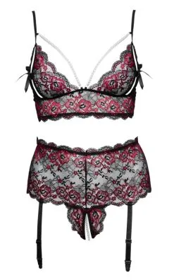 Soft-BH und Straps-Slip ouvert komplett aus weicher elastischer 2-farbiger Blütenspitze. Der BH punktet mit seinen Perlenketten im Dekolleté und seinen geschlitzten Cups, die nur von einem kleinen Schleifchen zusammengehalten werden. Die elastischen Träger sind verstellbar. Der Taillen-Slip ist in der kleinen Schrittöffnung mit einer stimulierenden Perlenkette ausgestattet. Die verstellbaren Strapse sind vom Slip abnehmbar. Die abgebildeten Strümpfe gehören nicht zum Lieferumfang und können optional erworben werden.