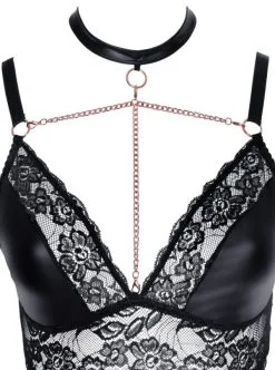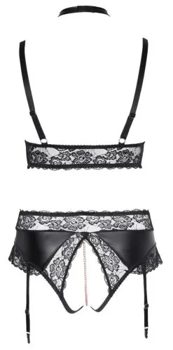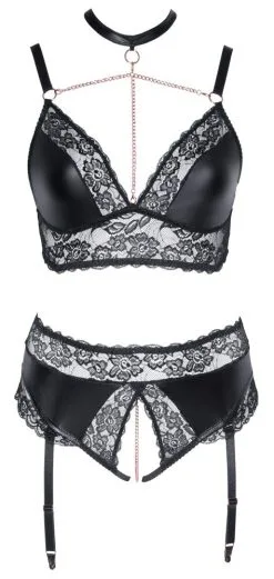 Soft-BH und Straps-Slip ouvert im Mix aus Wetlook mit weicher elastischer Spitze und roségoldfarbenen Elementen. Der BH punktet mit seinen Dekolleté-Ketten, die vom Halsband (mit Klettverschluss) und dem BH abnehmbar sind. Der Slip ist im Schritt bis über den Po einladend offen und mit einer stimulierenden Schrittkette ausgestattet. Die verstellbaren Strapse sind vom Slip abnehmbar. Die abgebildeten Strümpfe gehören nicht zum Lieferumfang und können optional bestellt werden.